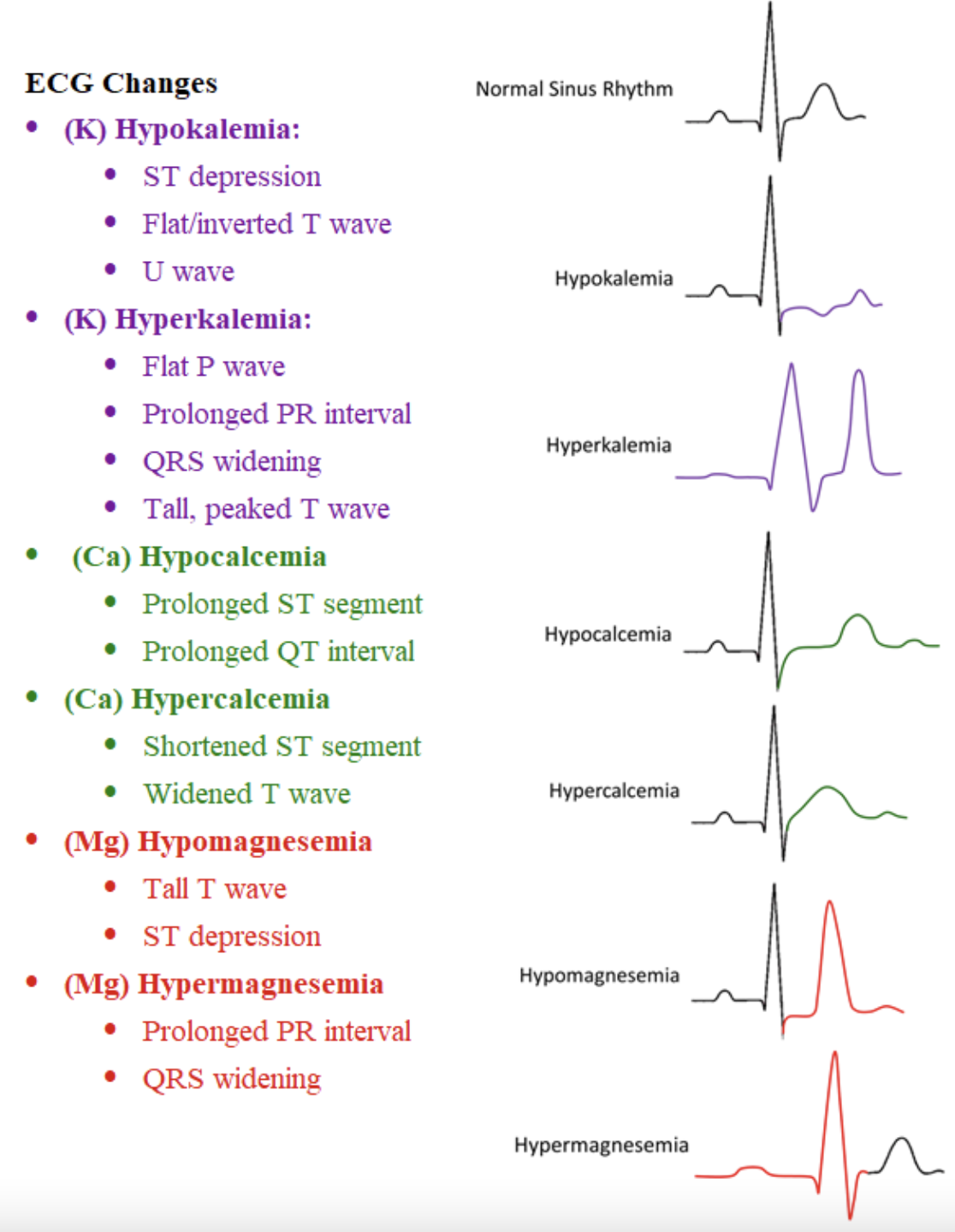 * Hyperkalaemia - ECG tall tented T-waves, wide QRS, prolonged PR - causes cardiac toxicity/muscle weakness - caused by drugs (k-sparing diuretics, ACEi/ARB, digoxin), Addison’s.