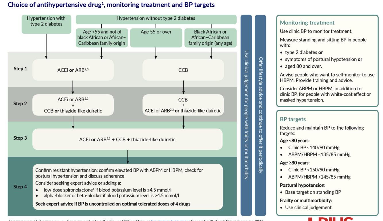 BP in clinic >140/90 —> repeat (both arms should be measured if >15 repeat then use measurement in higher arm)