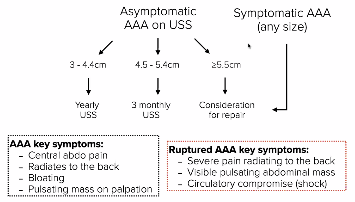 AAA key Sx & ruptured Sx? Ix? Mx?