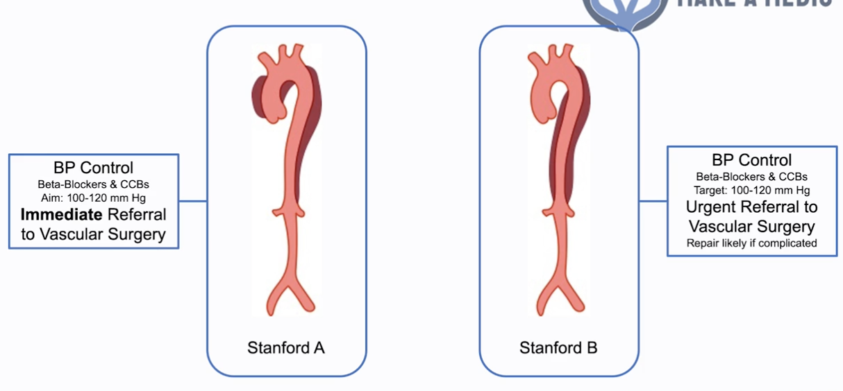 Sx: sudden onset, central tearing chest pain –> radiating to between shoulder blades