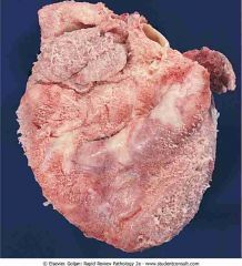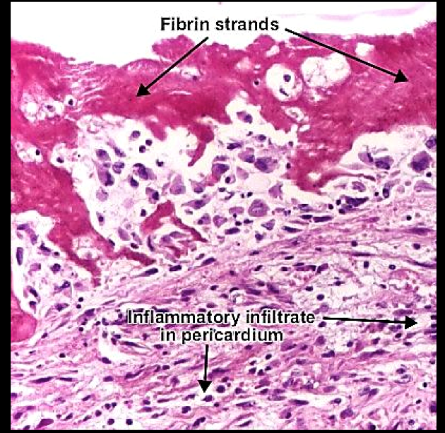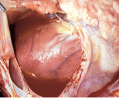 Transudate or exudate (+ fibrin - associated with mulberry heart disease)