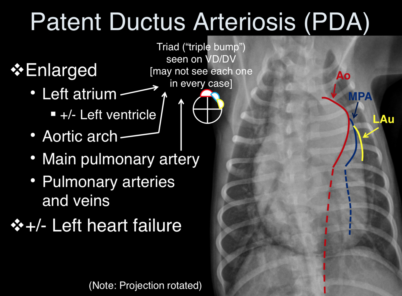 * Larger defects: left atrial and left ventricular enlargement with or without increased vascular pattern in the lungs