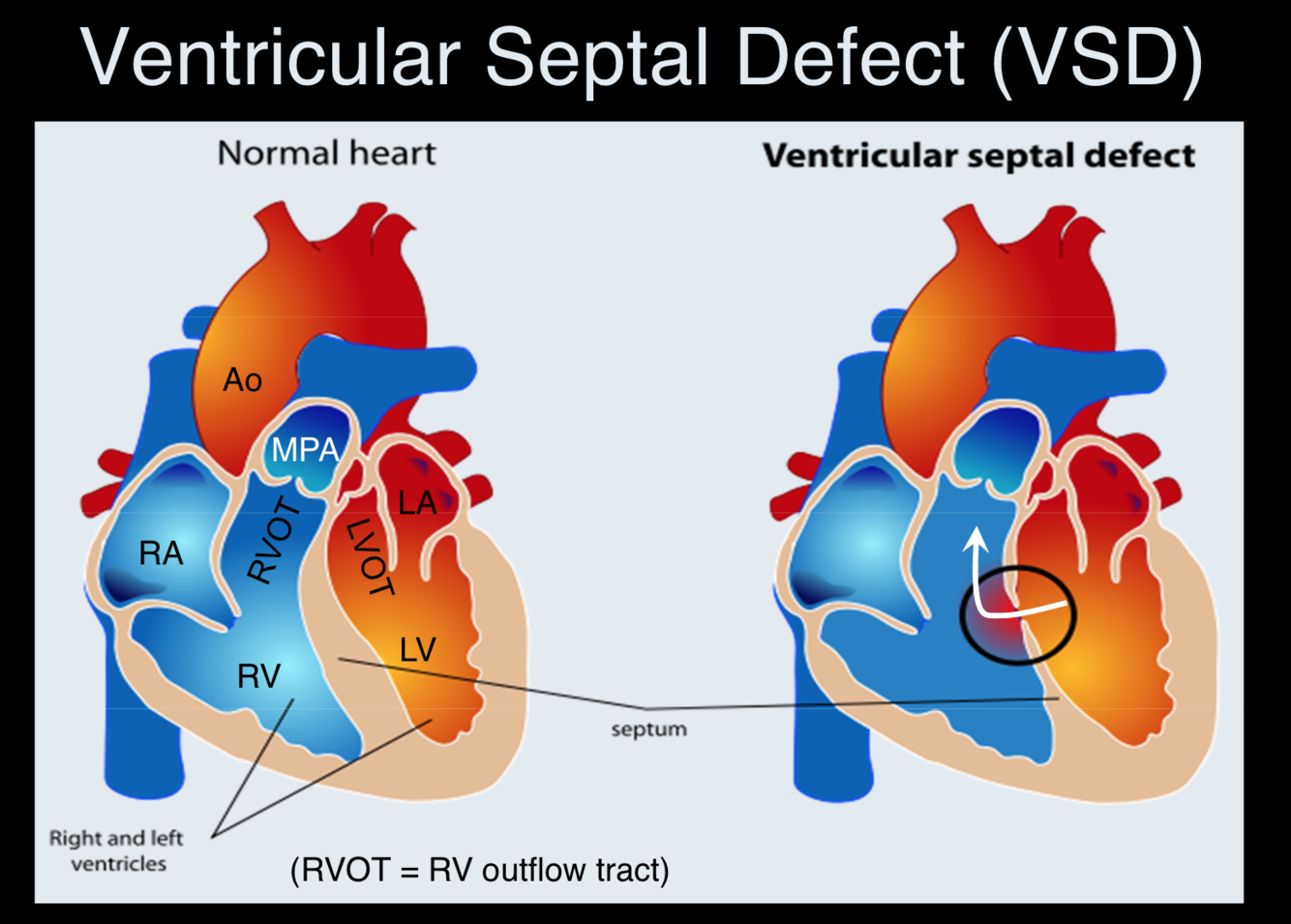 _In most cases_ it has been shown that the shunted volume moves **directly into the RVOT**, hence **right-sided enlargement is not usually a feature** of the condition. The shunted blood then enters the pulmonary circulation and finally returns to the left side of the heart. This results in **overcirculation of the pulmonary system and left-sided heart enlargement** (eccentric hypertrophy) if the shunt is significant. If left ventricular end-diastolic pressure increases sufficiently as a result, then **left-sided heart failure** will ensue.