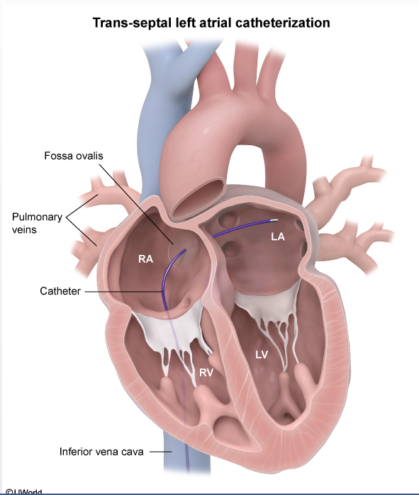 What structure does a venous catheter traveling from the right femoral vein pass through to get into the left atrium?