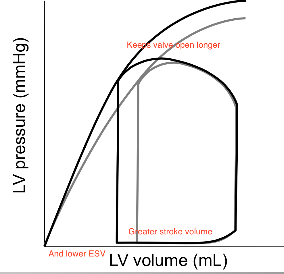 Results in low ESV and increase in SV. The increased force generation keeps the valves open longer.