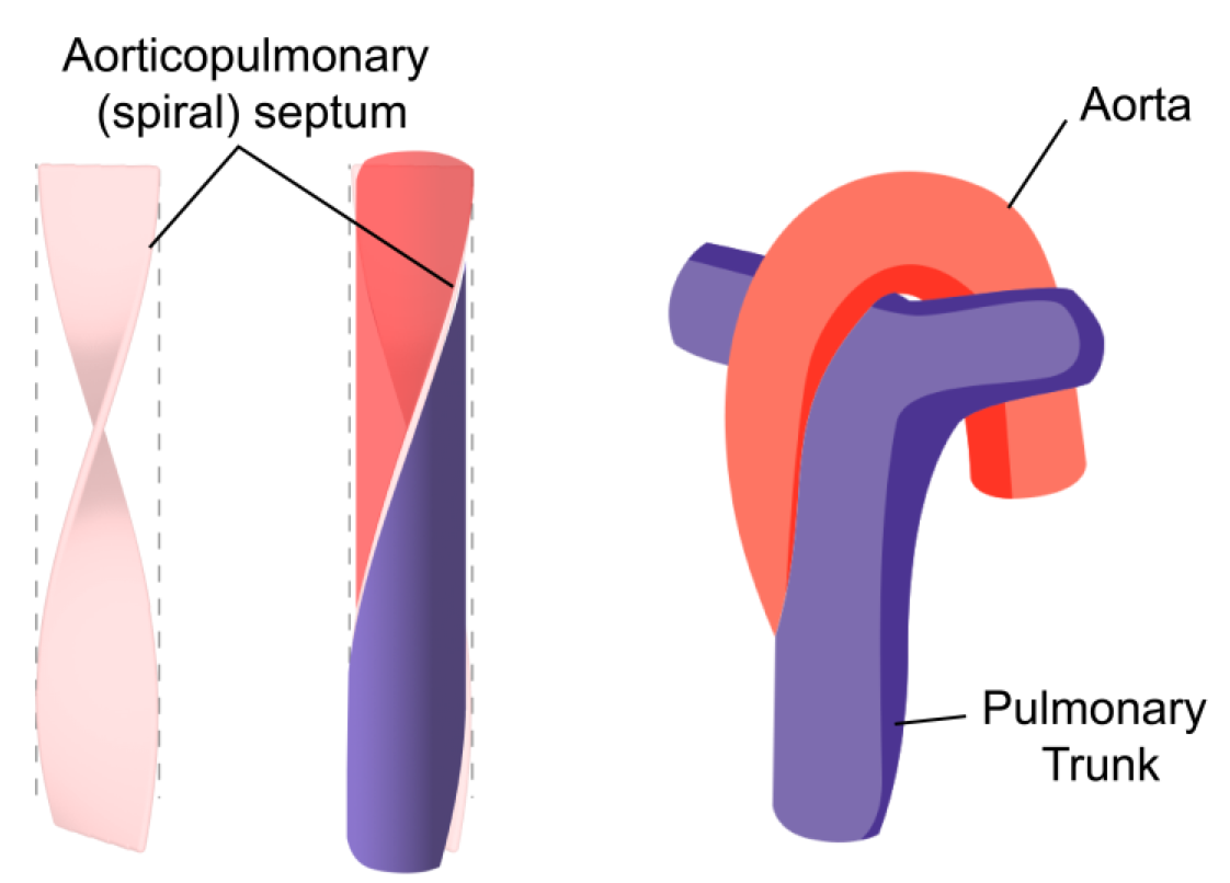 What occurs with the failure of the aorticopulmonary septum to spiral?