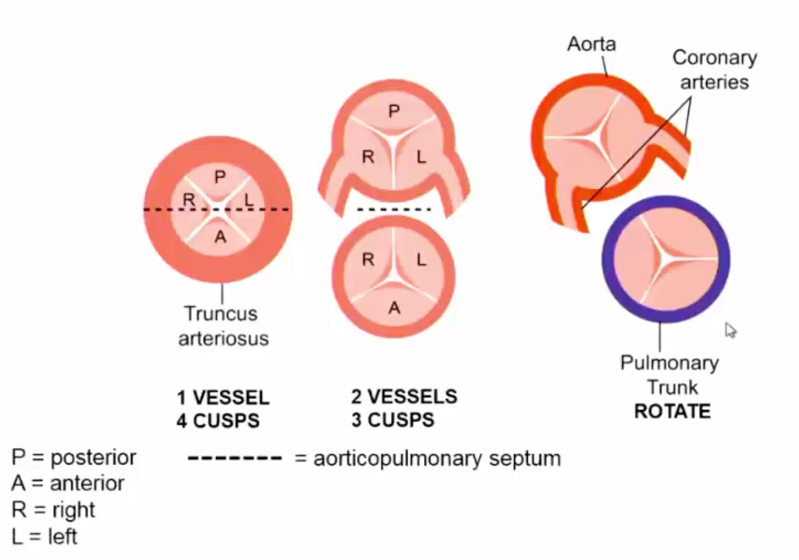 How does the truncus arteriosus develop into the aorta and pulmonary trunk?