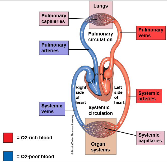 Pulmonary artery -> Pulmonary capillaries to become oxygenated -> Pulmonary vein ->