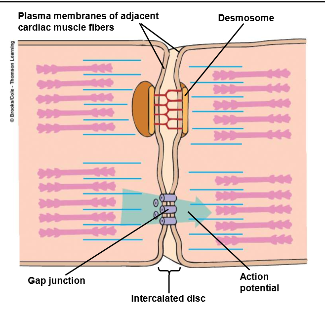 Electrical synapses between cardiac muscle cells where action potentials diffuse into the next Electrically coupled