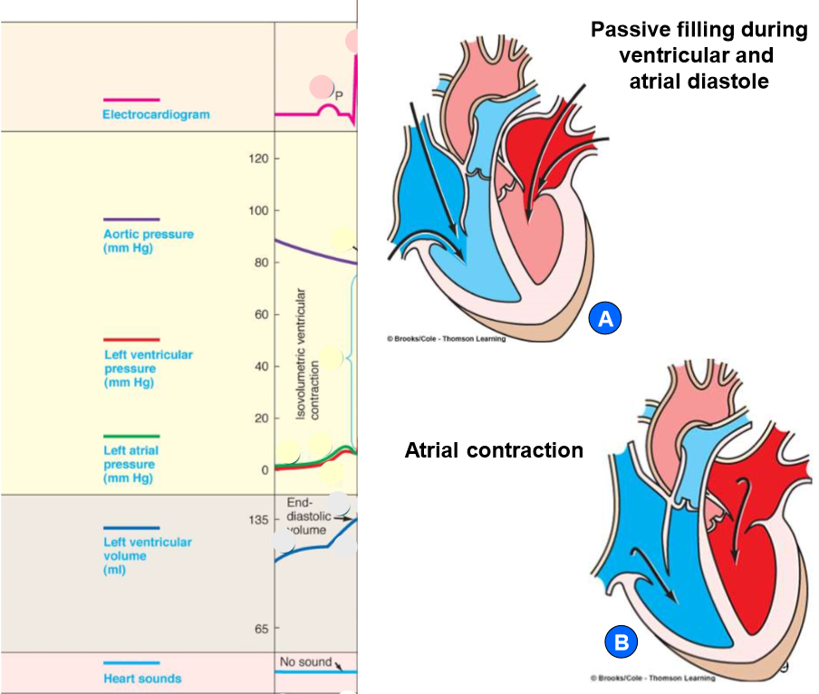 Passive filling during ventricular and atrial diastole then Atrial Contraction