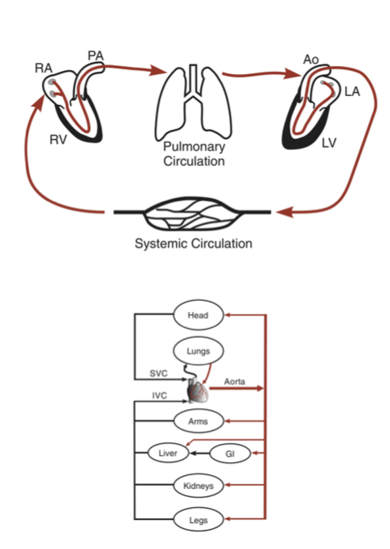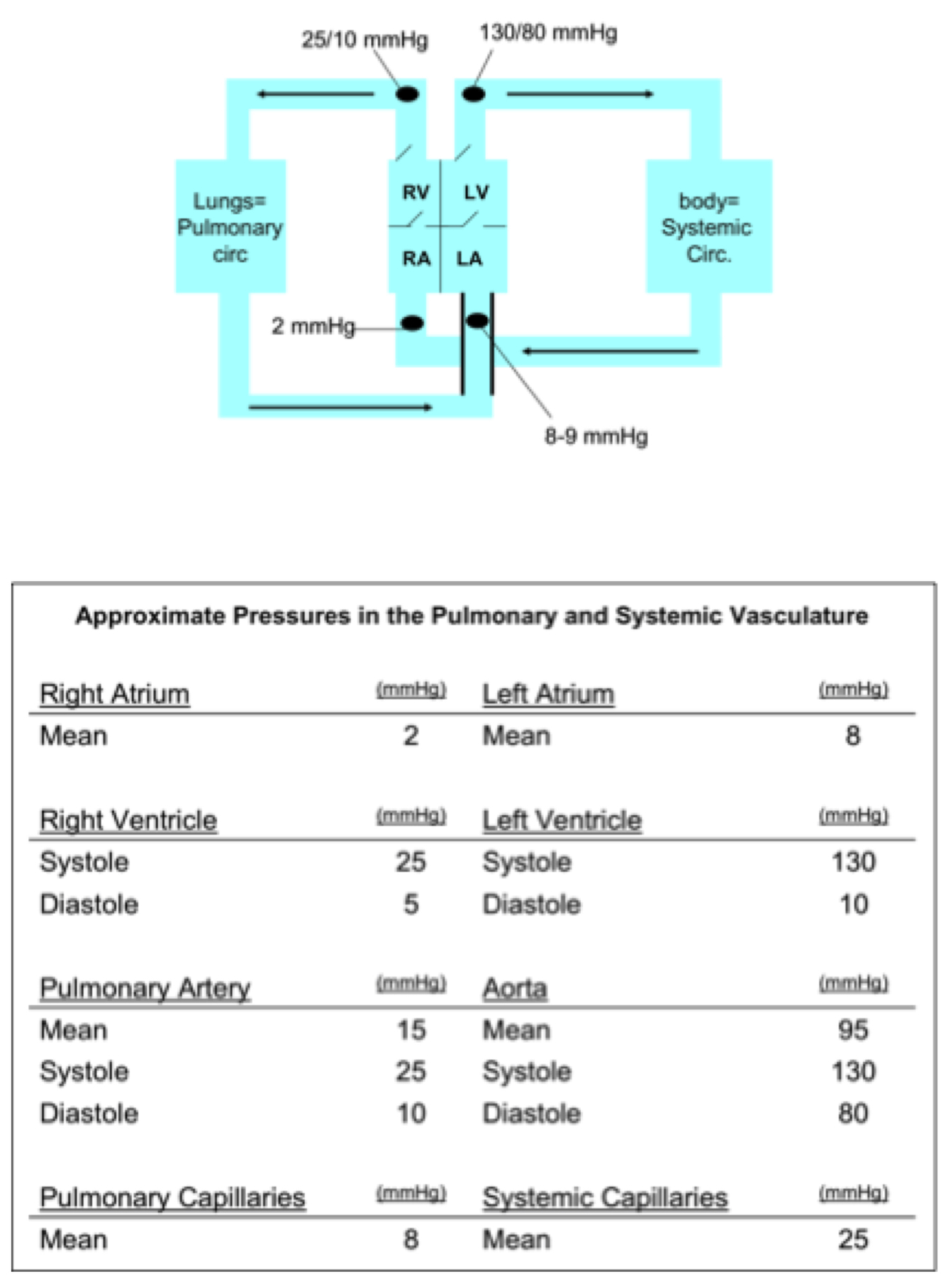 Inferior/Superior Vena Cava (spO2 ~ 75%) ⇒ Right Atrium ⇒ Tricuspid Valve ⇒ Right Ventricle ⇒ Pulmonic Valve ⇒ Pulmonary Artery ⇒ Pulmonary Circulation (~2-25 mmHg)