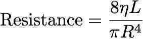 Describe an equation relating resistance to vessel radius, viscosity and length.