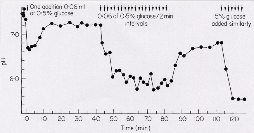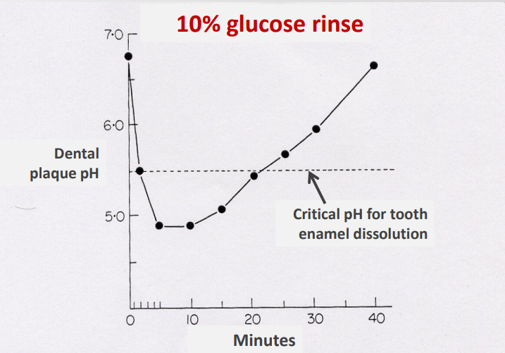Plaque pH falls quickly following exposure to glucose and will rise back to its original value after 20 minutes or so, unless exposure continues.