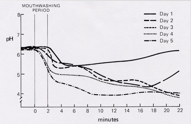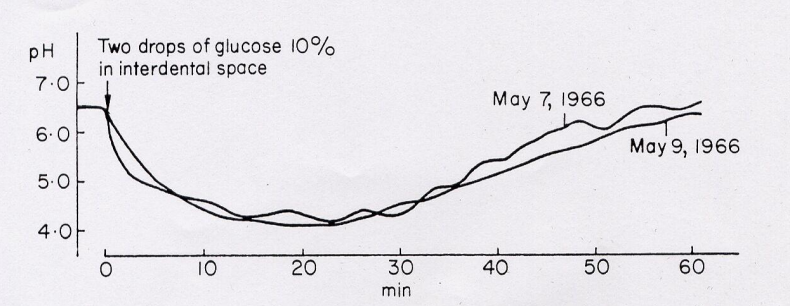 The sugar did not reach the tongue so that saliva flow was not stimulated - this result may, therefore, differ from the changes during normal eating when saliva flow is stimulated and the saliva probably reaches the plaque, but may resemble the changes in plaque when saliva cannot easily reach it as in fissures and inaccessible contact points.