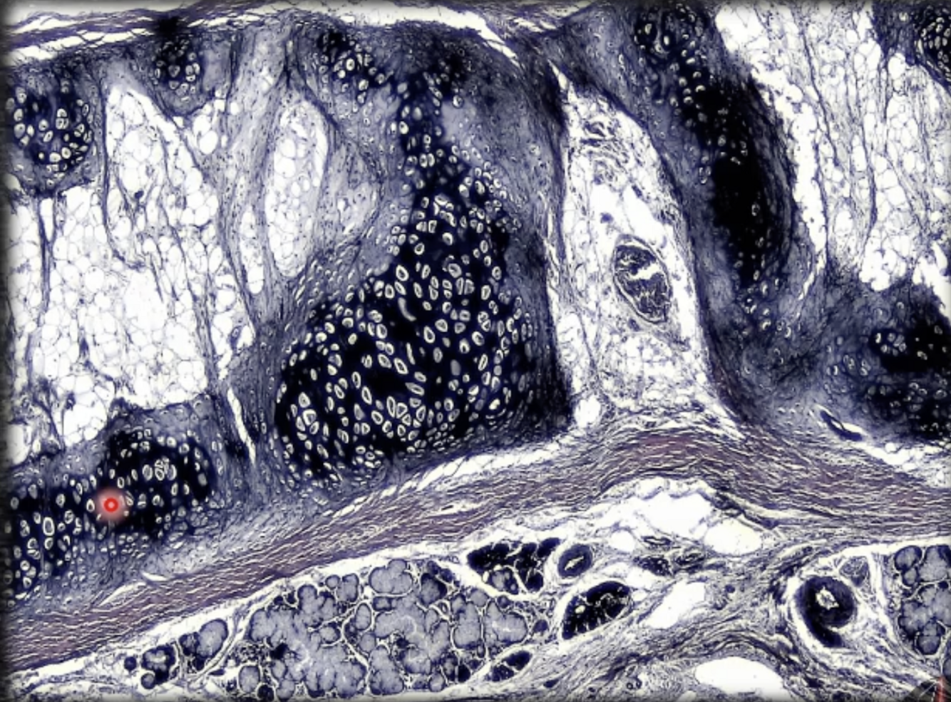 Hyaline, has glass-like appearance (transparent) also cells appear in little “nests”
