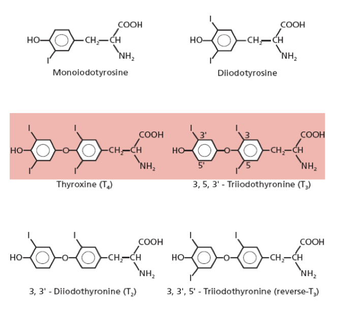 Describe the synthesis of T4 and T3 from tyrosine