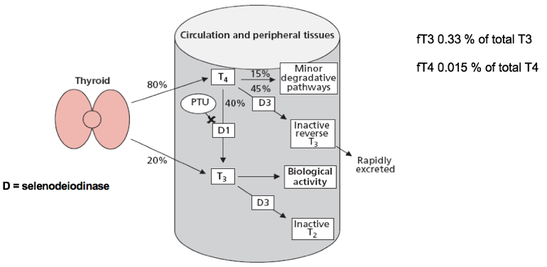 How is thyroid hormone metabolised in peripheral tissues and in the circulation?