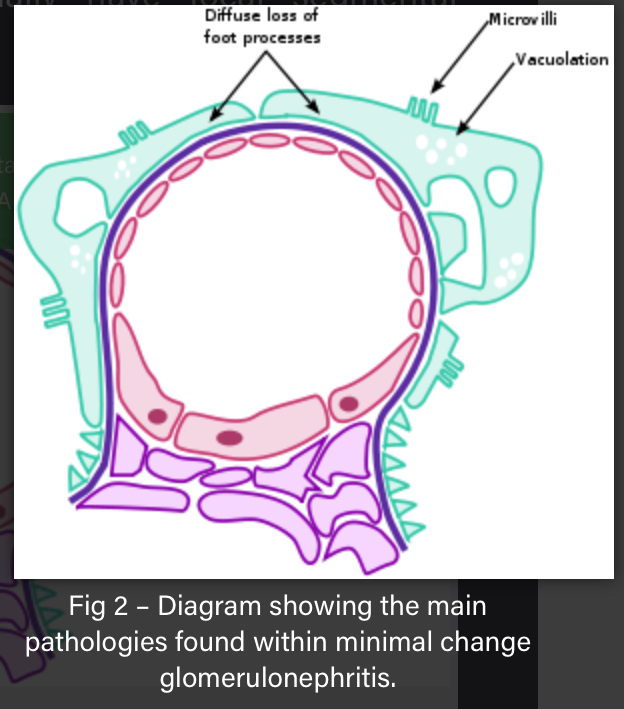 There’s diffuse effacement of foot process of podocytes - in which there’s widening of filtration slits.