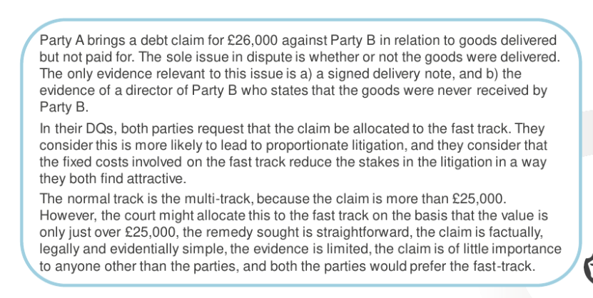 Will be based on other things like nature of remedy, likely complexity of facts/law, number of parties, value of counterclaim/Part 20 claim, amount of oral evidence, views expressed by parties etc.