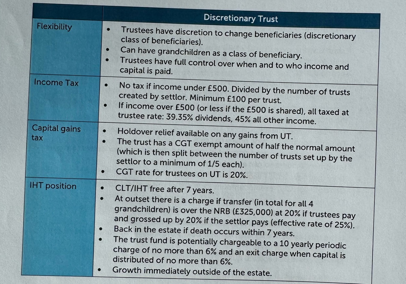 Explain how a discretionary trust works and the taxation implication of using one for gifting to grandchildren