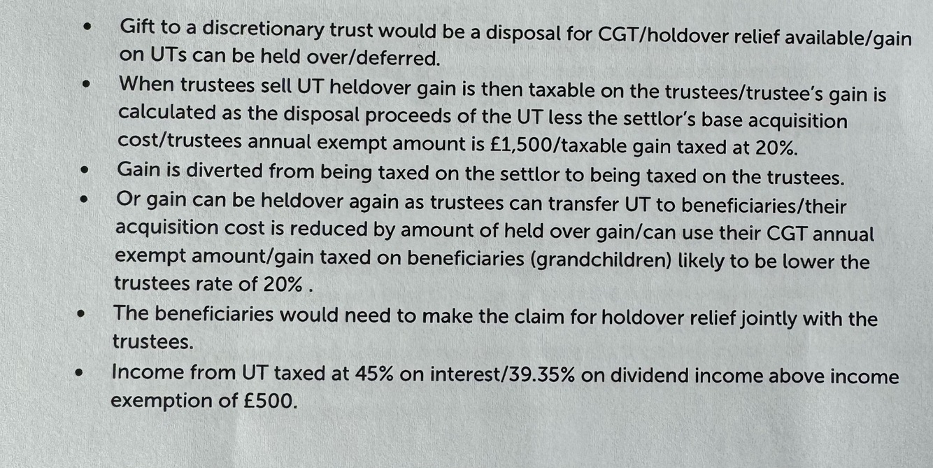 Explain the income tax and cgt implications of gifting their unit trust into a discretionary trust
