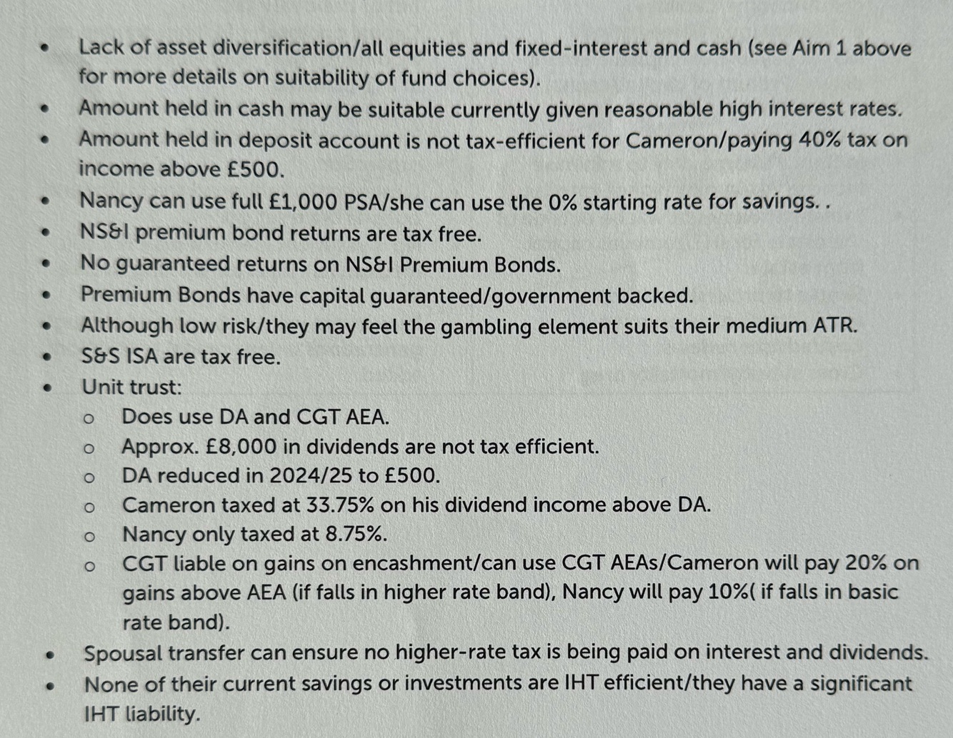 The factors to consider when advising on suitability and tax efficiency on their existing savings and investments