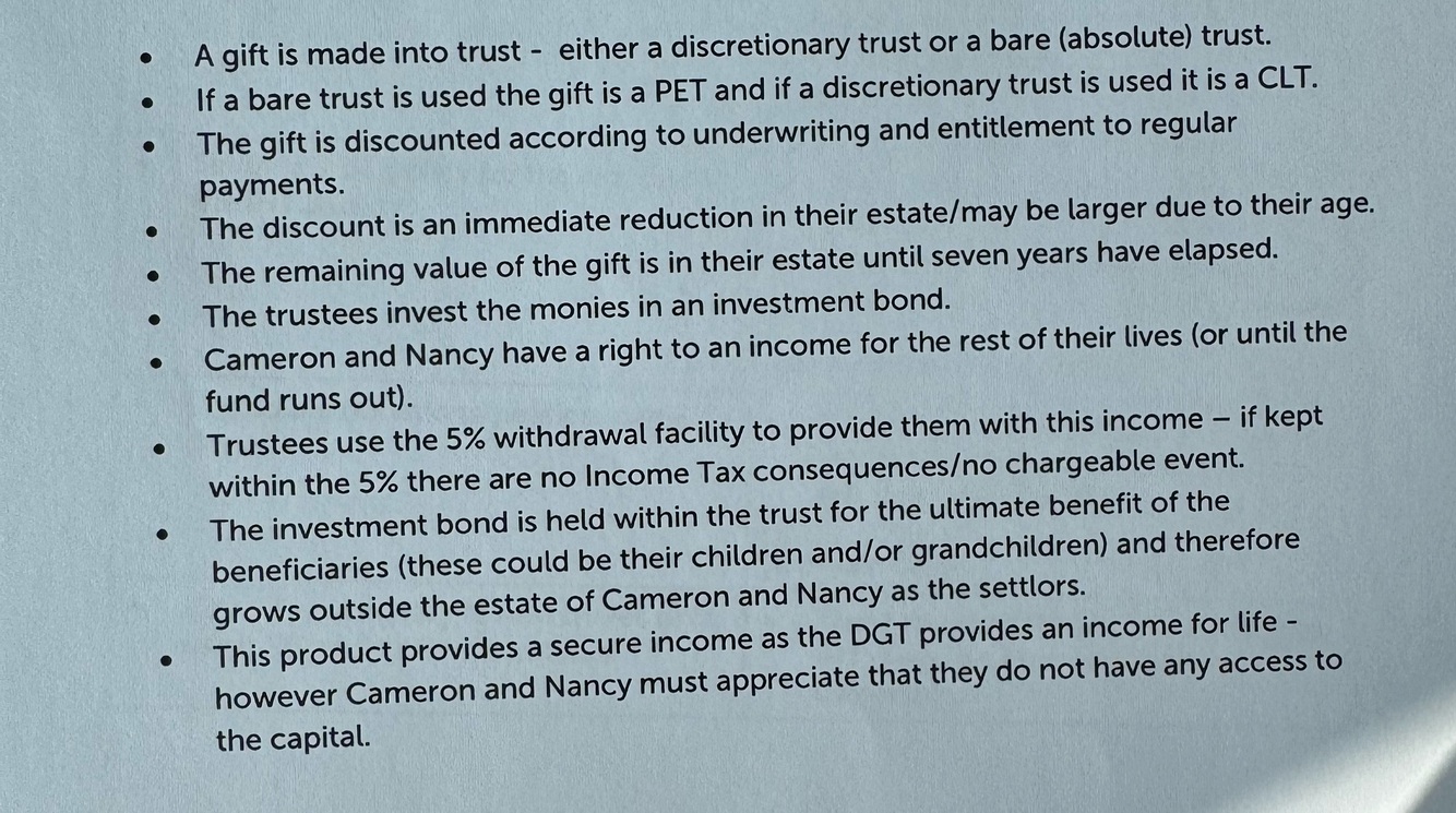 Explain what a discounted gift trust is and how it may help them secure tax efficient income and help their iht