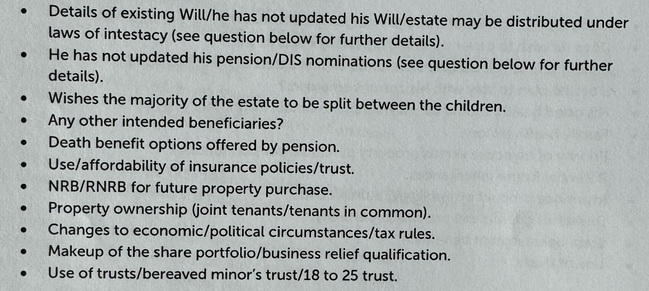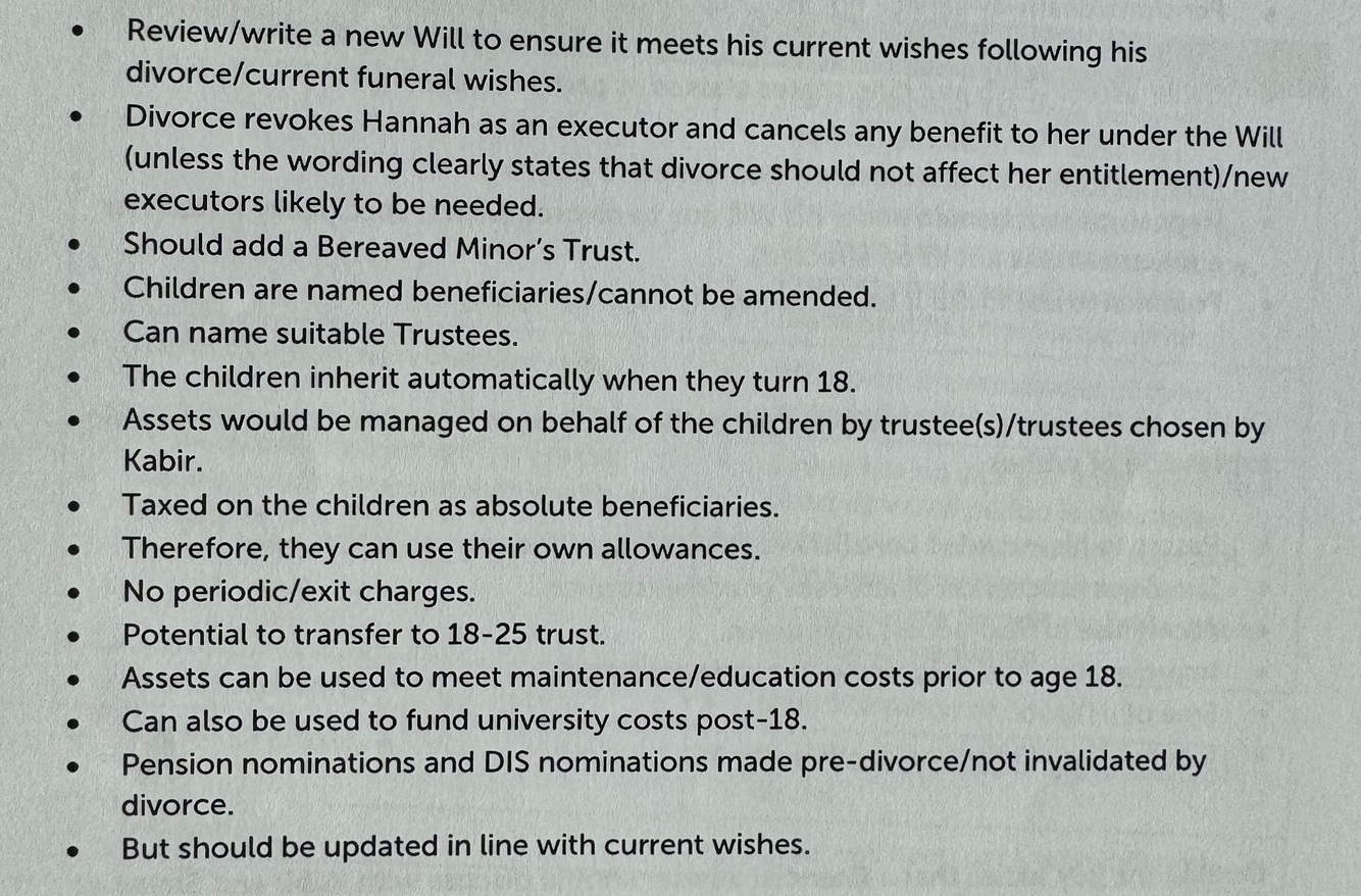 Identify the factors that an adviser would consider when advising them on their objective to ensure that the children will receive kabirs estate on death