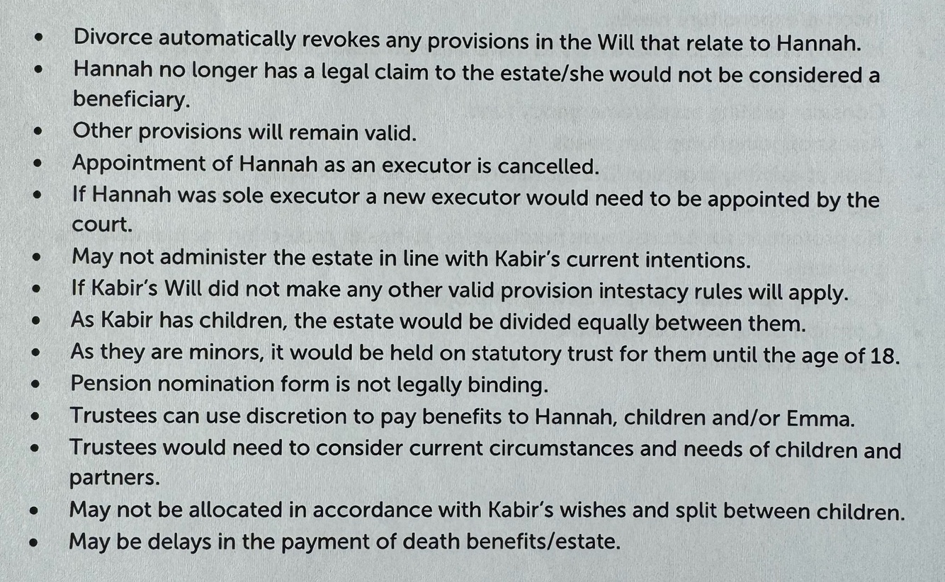 Explain in detail to kabir the implications of not updating his will and nominations following his divorce