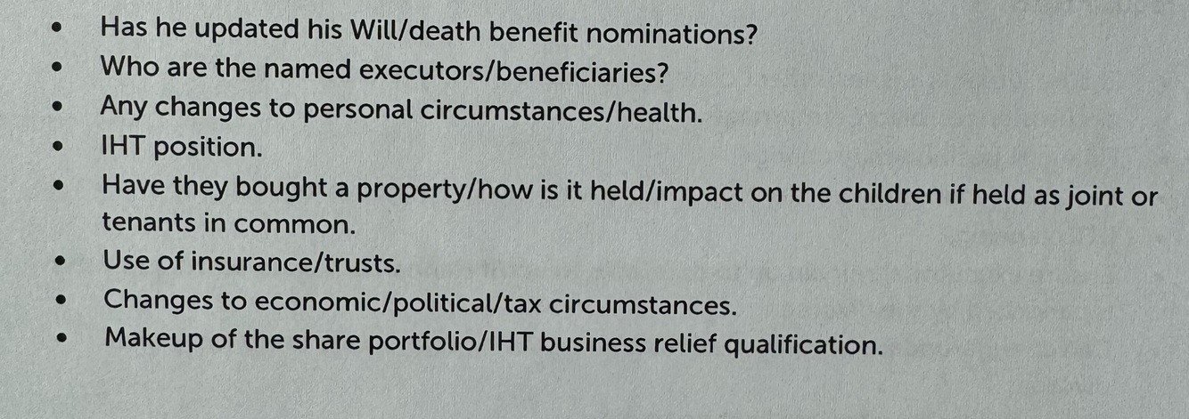 Outline the key issues that an adviser should discuss with them at an annual review regarding their objective to ensure the children receive kabirs estate on death