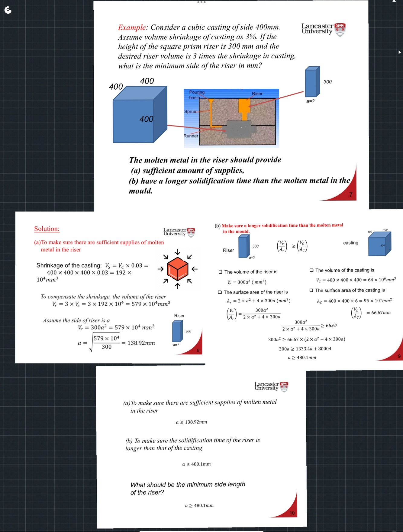 Molten metal in riser must solidify more slowly then the Metal inside the Cavity