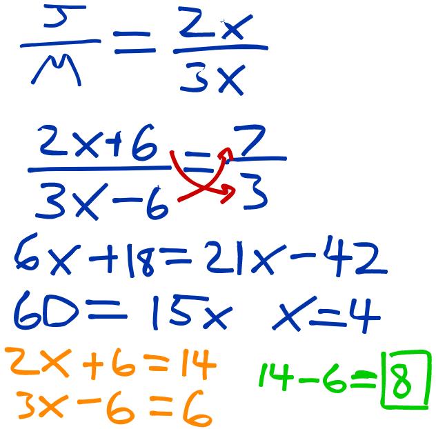 Plug in x –> (2x + 6) / (3x - 6) = 14 / 6 –> 14 - 6 = 8