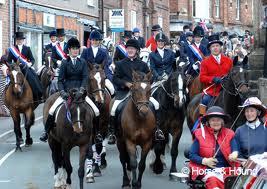(noun) a procession of people traveling on horseback