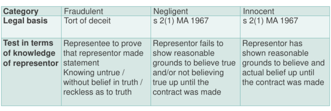 Fraudulent (tort of deceit), Negligent (statutory claim), and Innocent (statutory claim).