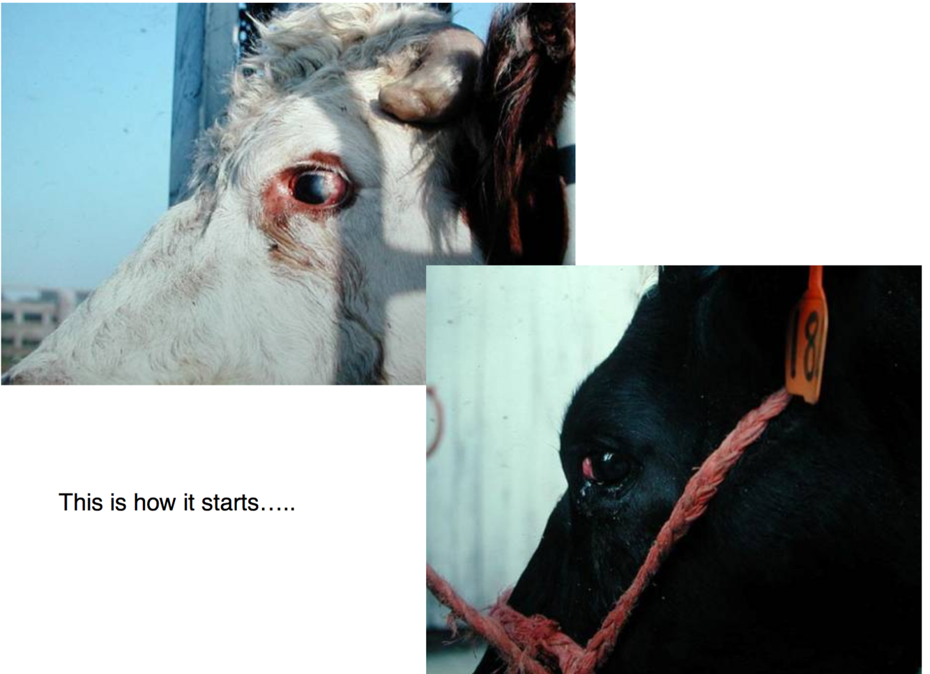 ** Commonly young cattle, 5-10% of a group affected (can be 80%), if not rapid or effective treatment animals left with corneal scarring (opacity) that can reduce sight…. short immunity to disease in recovering cattle