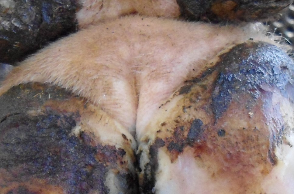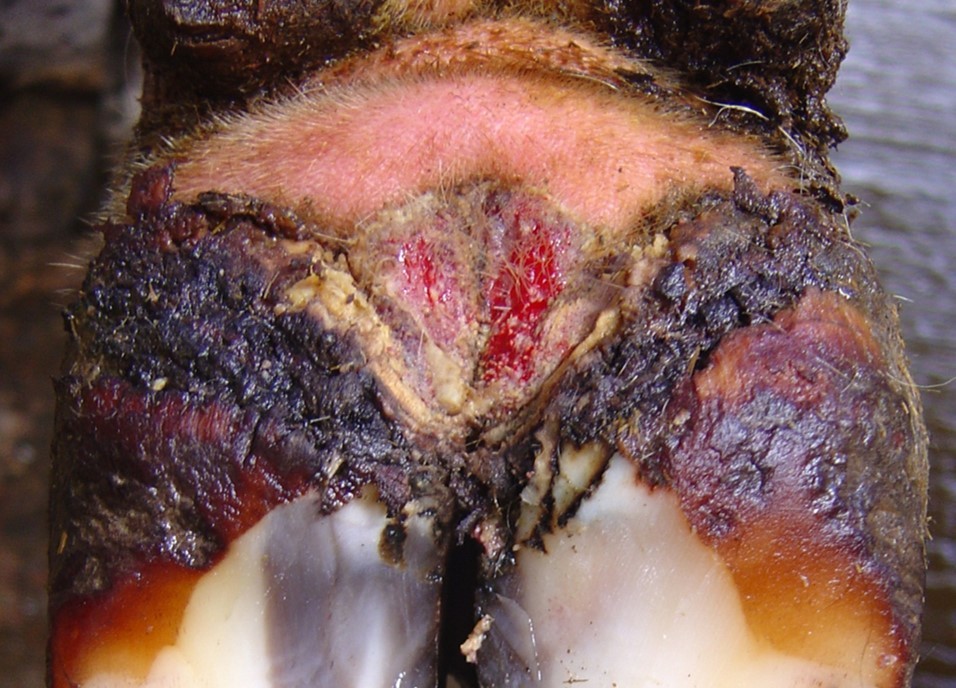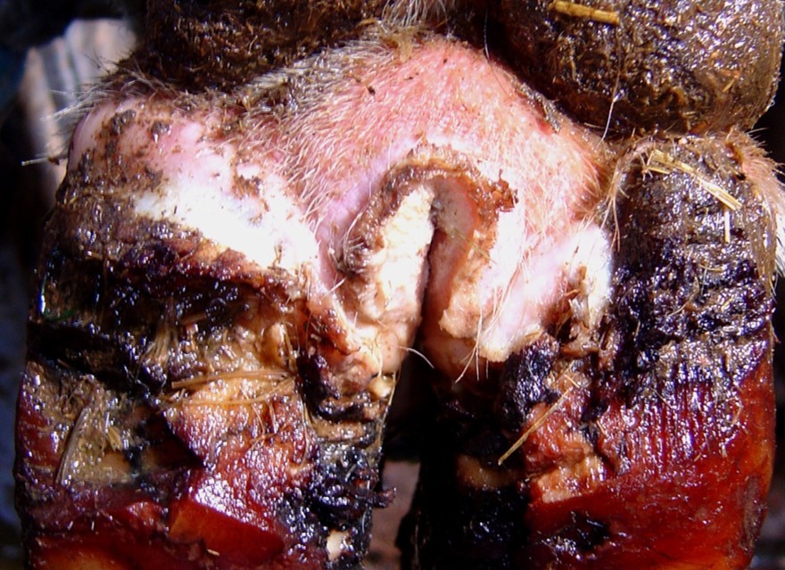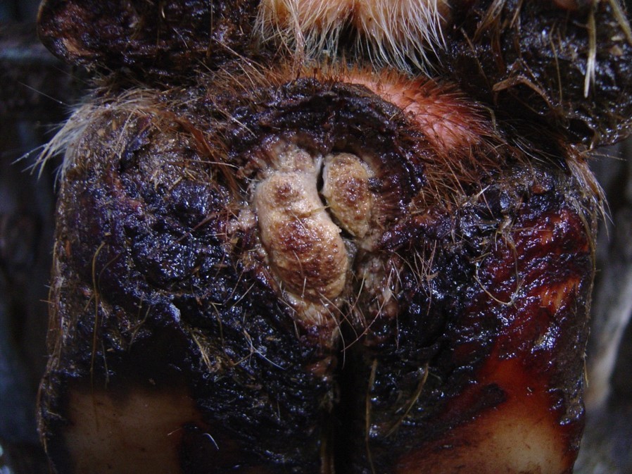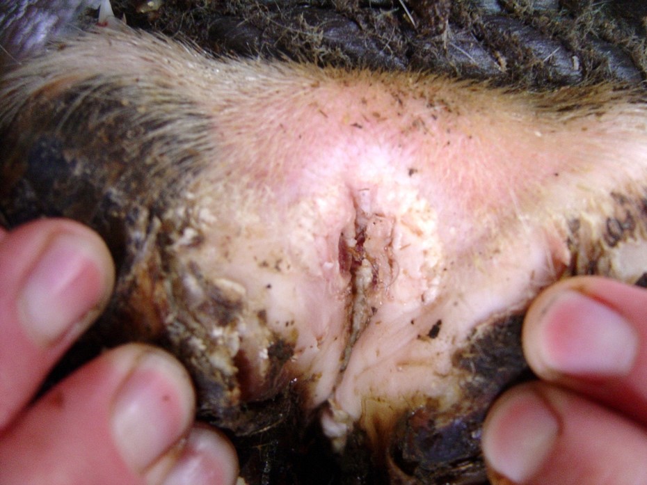 –Occasionally skin above one heal bulb only, interdigital space between claws, coronary band at front of the foot, around accessory digits