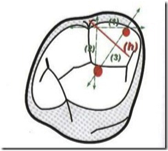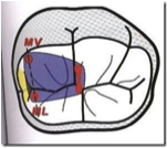 1ère molaire maxillaire : aller chercher la perpendiculaire entre le pont d’émail et la ligne qui unie la mésio vestibulaire et la mésio linguale. Aller à la jonction vestibulaire de la cuspide palatine et le sillon central précisément (ne jamais aller au-delà du pont d’émail). La cavité sur une molaire maxillaire doit être triangulaire. Souvent il faudra enlever la cuspide mésio-vestibulaire car elle gêne l’insertion des instruments par la suite.