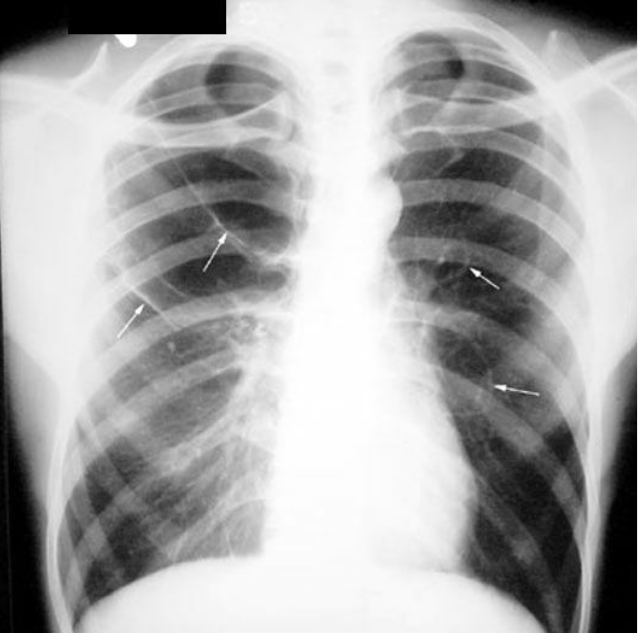 Thick walled cavities (greater than 5 mm) are due to aspiration lung abscess, necrotizing pneumonia, squamous cell cancer, Blastomycosis and Wegener’s granulomatosis.