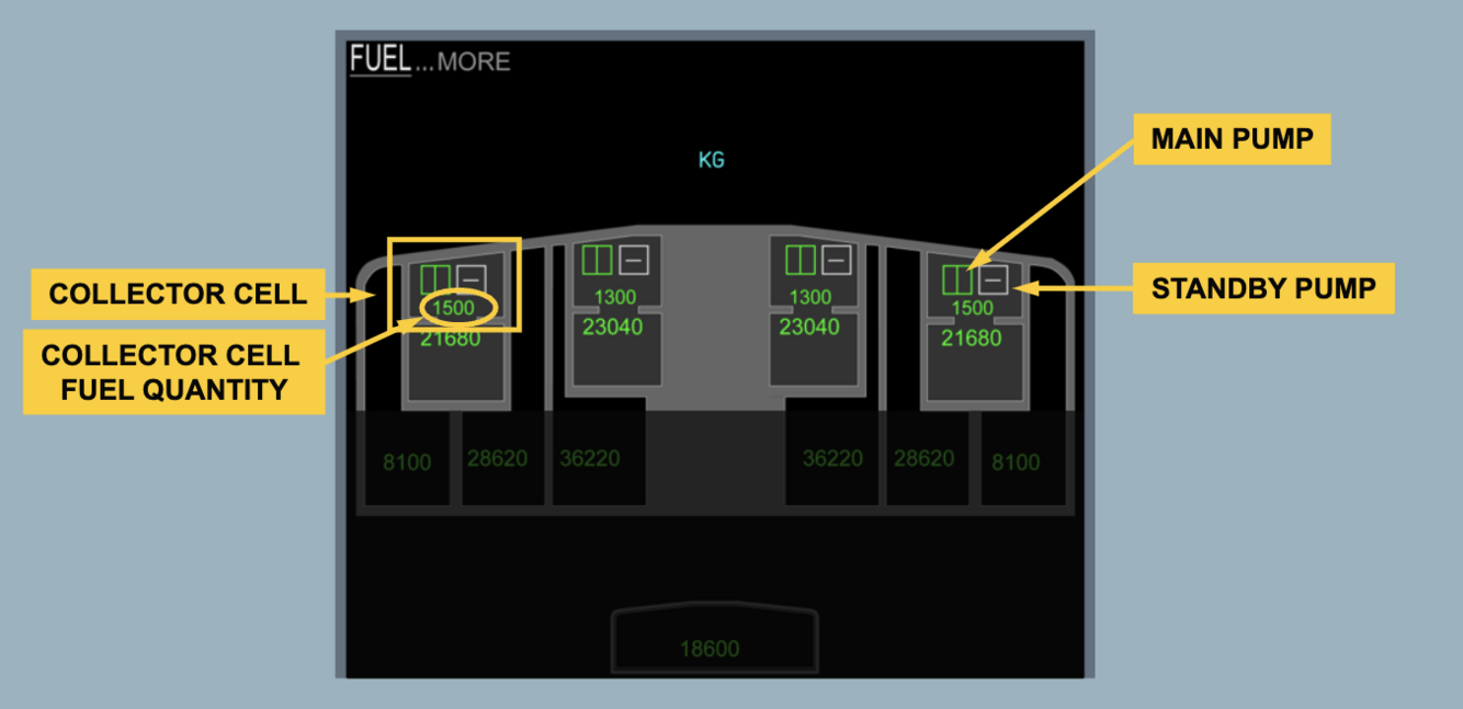 Engines can be fed by gravity via non return valves at the bottom the collector cell. FEED TKs 1 anf 4 will operate normally but FEED TKs 2 and 3 will each have 2000kg of unusable fuel