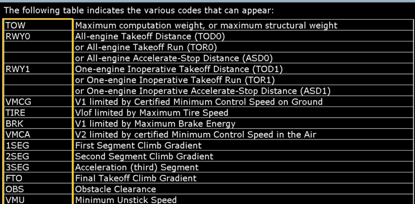 What are the limitation codes on the takeoff performance application?