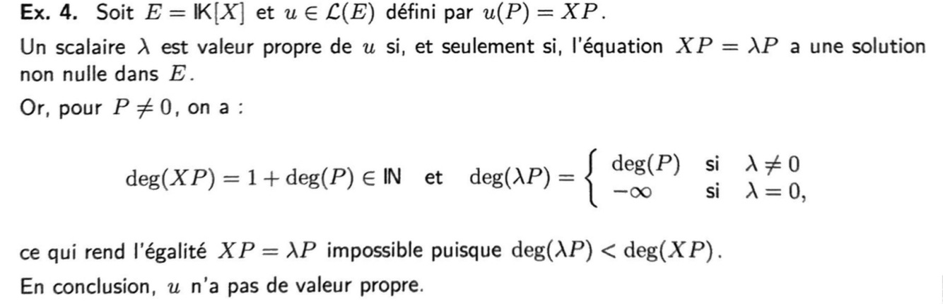 Soit E = IK[X] et u€L(E) défini par u(P) = X P . Déterminer ses valeurs propres.