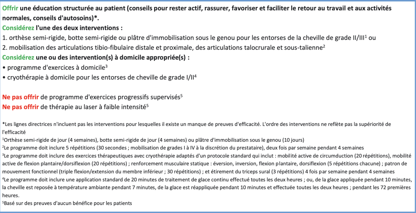 Quel est la prise en charge pour une entorse de la cheville de moins de 3 mois.