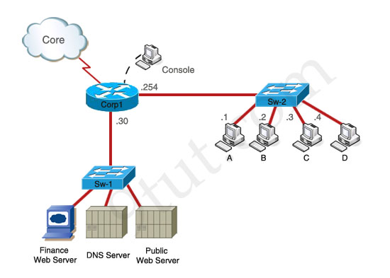 A network associate is adding security to the configuration of the Corp1 router. The user on host C should be able to use a web browser to access financial information from the Finance Web Server. No other hosts from the LAN nor the Core should be able to use a web browser to access this server. Since there are multiple resources for the corporation at this location including other resources on the Finance Web Server, all other traffic should be allowed.