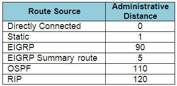 When one route is advertised by more than one routing protocol, the router will choose to use the routing protocol which has lowest Administrative Distance. The Administrative Distances of popular routing protocols are listed below: