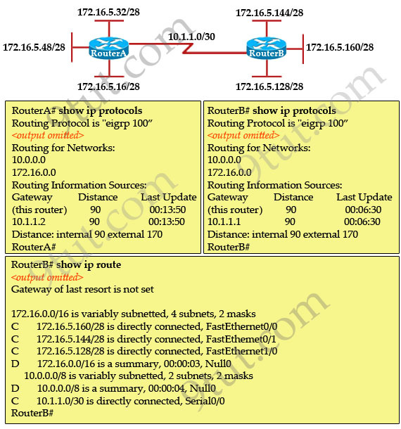 Note: EIGRP performs auto-summarization each time it crosses a border between two major networks. For example, RouterA has networks of 172.16.x.x. It will perform auto-summarization when sending over network 10.1.1.0/30, which is in different major network (172.16.0.0/16 and 10.0.0.0/8 are called major networks in this case).