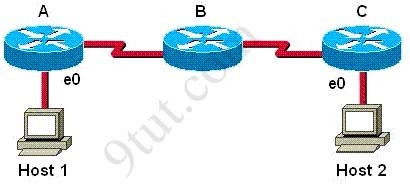 Host 1 is trying to communicate with Host 2. The e0 interface on Router C is down. Which of the following are true? (Choose two.)