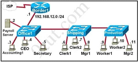 Access lists and VLANs can be used to prevent unauthorized to the Payroll Server. By assigning the server to a secure VLAN and using access list to permit only Accounting1, CEO, Mgr1, and Mgr2 workstations to access that VLAN, we can dramatically enhance the security of the whole network.