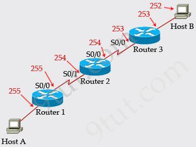 Refer to the exhibit, Host A pings interface S0/0 on router 3, what is the TTL value for that ping?