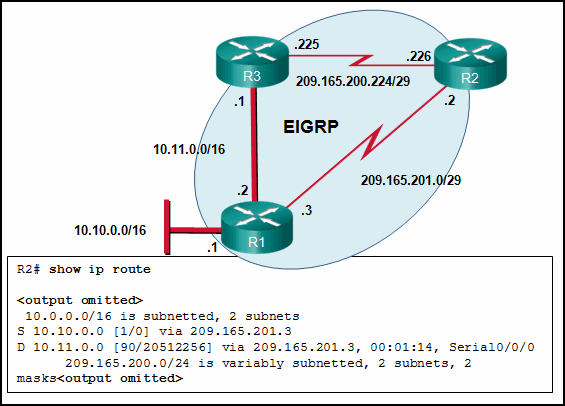 Refer to the exhibit. What is the administrative distance value that indicates the route for R2 to reach the 10.10.0.0/16 network?