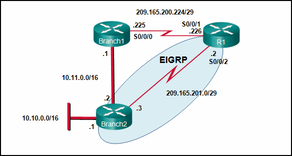 Refer to the exhibit. Currently router R1 uses an EIGRP route learned from Branch2 to reach the 10.10.0.0/16 network. Which floating static route would create a backup route to the 10.10.0.0/16 network in the event that the link between R1 and Branch2 goes down?